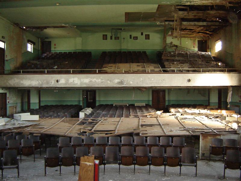 Tealman and I found a way in through the back door which led to the stage. The inside of the building shows what a beautiful building this once was. The deterioration of the ceiling and roof make it look pretty bad, but one can still see what a gorgeous building this once was. Here are some pics of the main area.