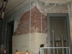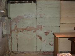 Right inside the door looking north towards the garage door. | A closer look at where the wall angles out. You can see the where the plaster is peeled revealing the bricks underneath. | One of the garage doors. |