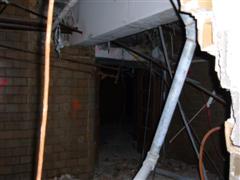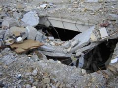 A distant shot showing piles of ruble, ground up building, the underground hallway, and the new ESH in the background.
