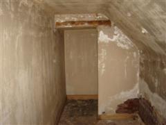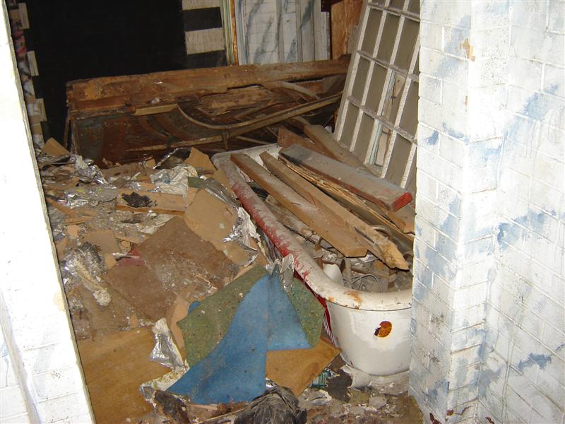 The corner of the room. Here water had ruined the roof, ceiling, and the ground below it.