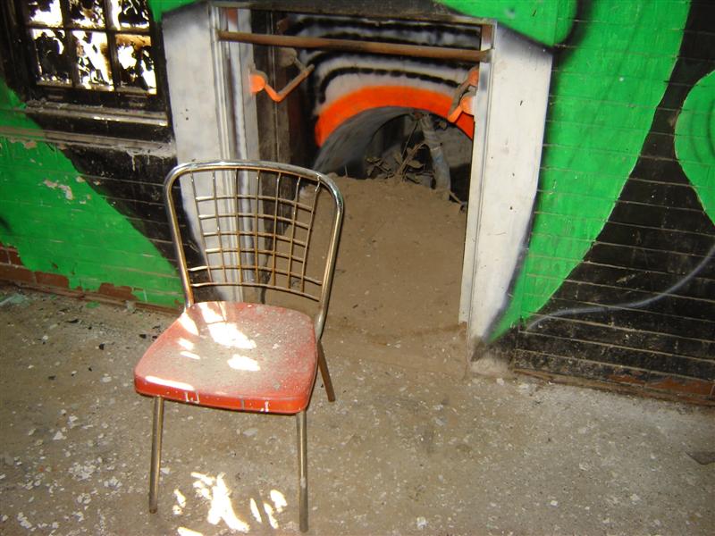 The middle of the pigeon shit filled room. Here is some type of chair.