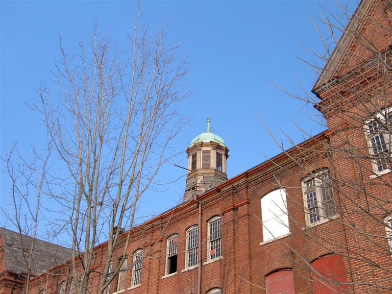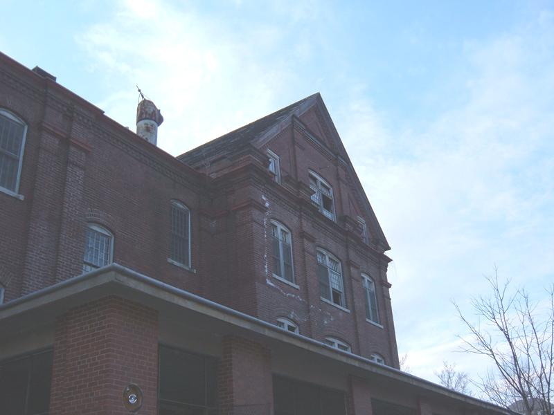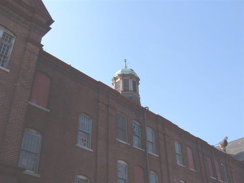 The gaping hole in the roof. The vent system curved out and then went to either side of the building.