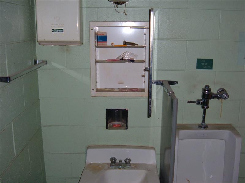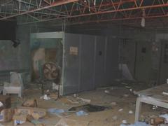 Getting in the larger building was easy as the door was wide open. Broken glass and other junk made walking around a bit difficult, but I managed. I can only guess that this building was some type of utility room. It was completely cinder block, but there was a register for the heater.