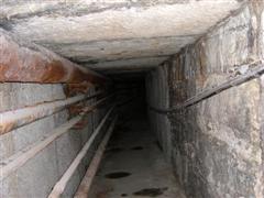 Original piping. | A heavily augmented shot so you can see farther down. This is in the opposite direction headed back from the Courthouse. | Some of the pipes were falling off. You can see the muddy floor and a bilge pump later installed to keep water out. |