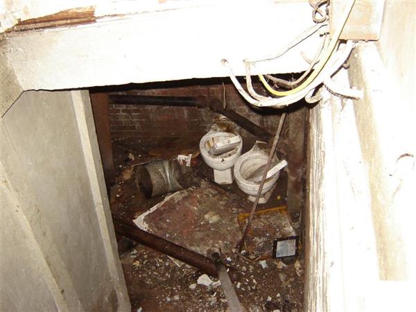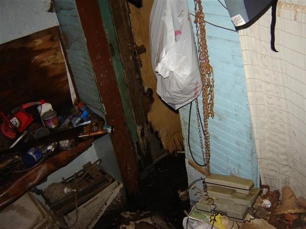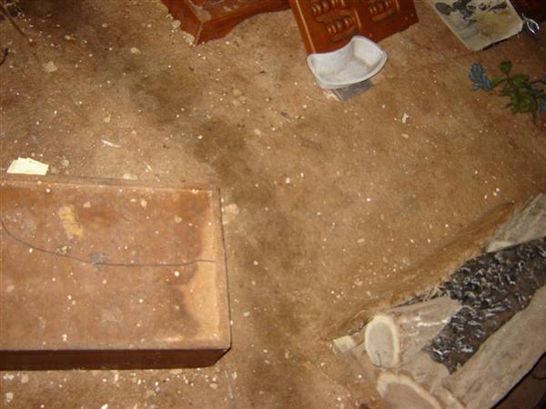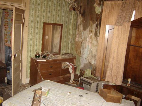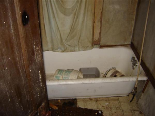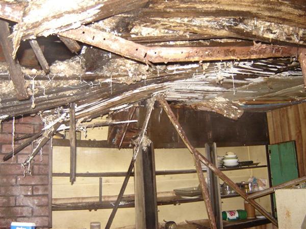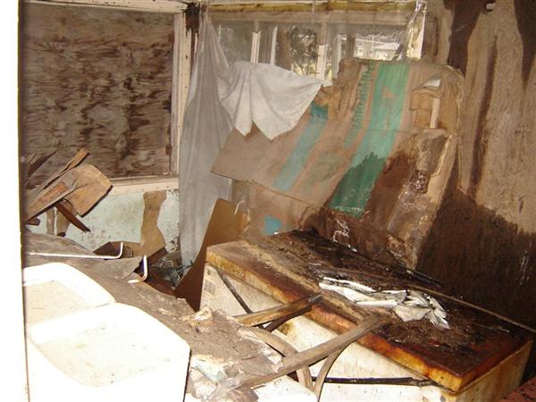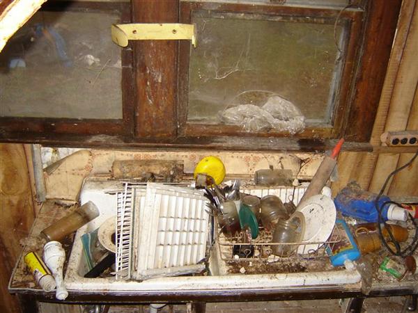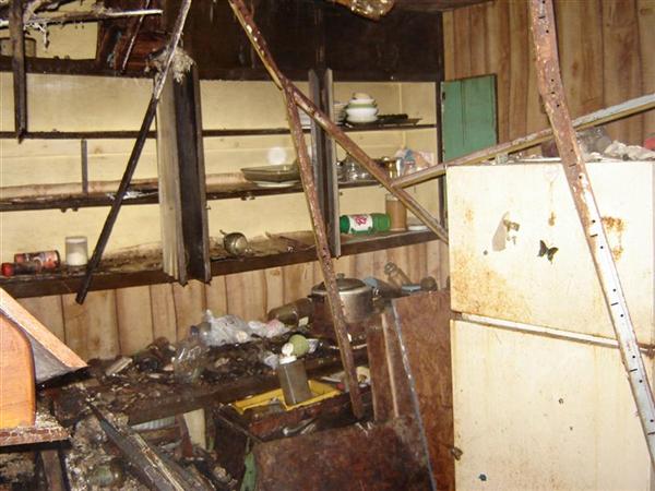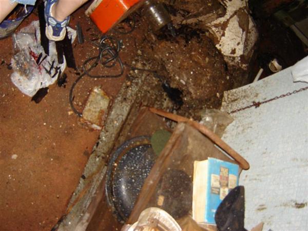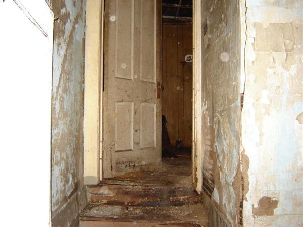 When we went it, it was quite scary. The steps were missing so we kinda had to jump to get into the kitchen area. We were greeted with falling ceilings, the smell of rotting wood, and the wonderful mold murals that were left for us by nature.