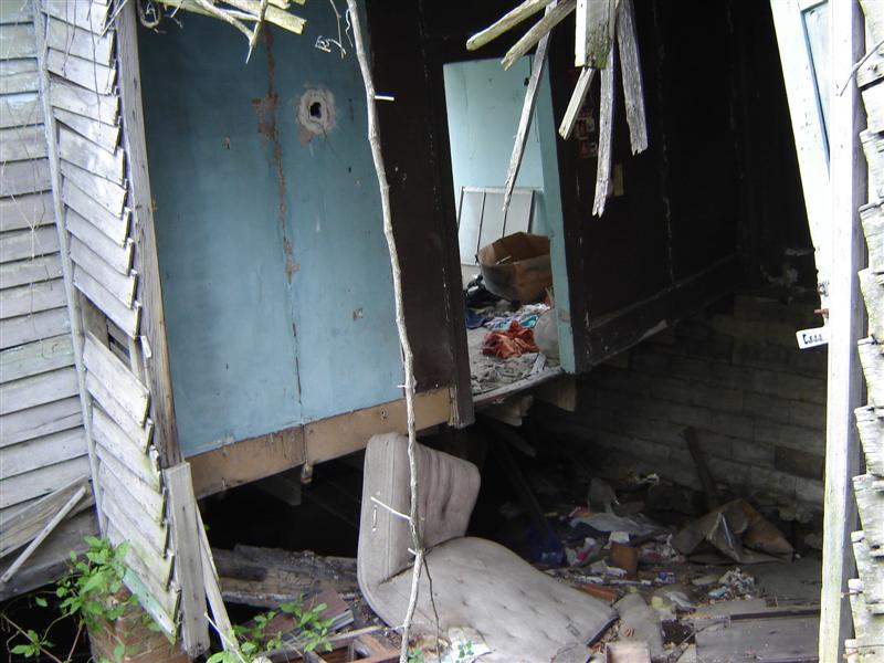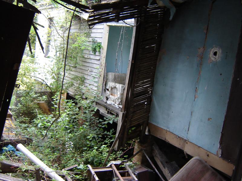 The backside of the house. You can see what I mean by two buildings. This is behind the one we were just in. | Ah, here we go. You can see the partition area. I'm guess a deck of some sort connected the rest the house. | Under the house. You can see how it was built high up to avoid flood water. Now it's all caving in. This was actually inside the door from two pictures ago. |