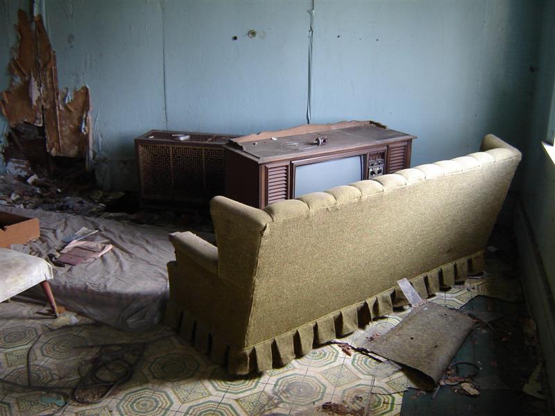 The other part of the house. The part that would have been called the front. It consisted of three parts. The first was the hallway, which now leads to certain death. There was a room to the right, presumably the living room judging by the tv. And there was a room to the left which had an old stereo, but we couldn't really go in because the floor was very warped and collapsed.